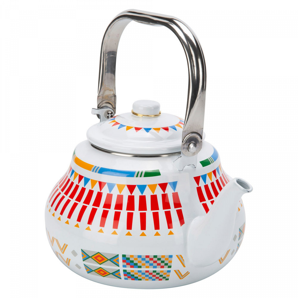 إبريق شاي مصنوع من الغضار (مادة خزفية) ويتميز بنقوش مستوحاة من فن القط العسيري، وهو فن شعبي من منطقة عسير في المملكة العربية السعودية. مزينًا بأنماط هندسية وزخارف ملونة تعكس الهوية الثقافية للمنطقة.