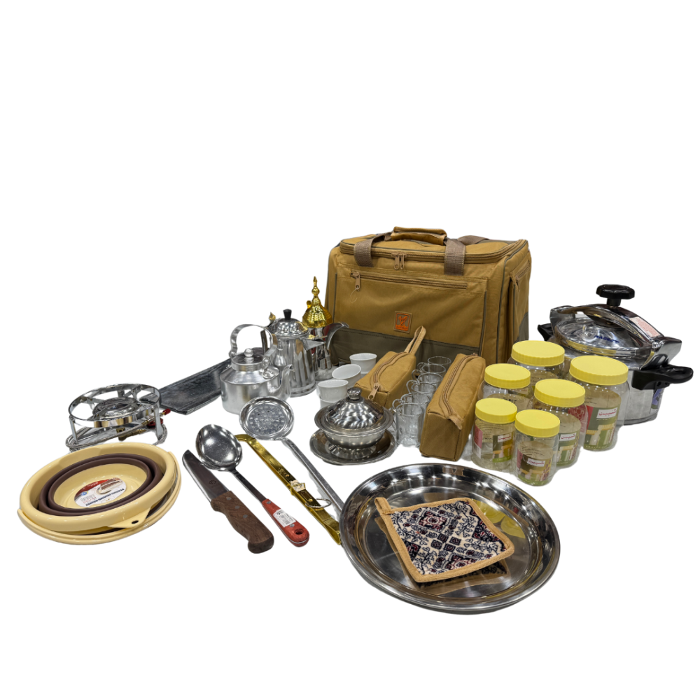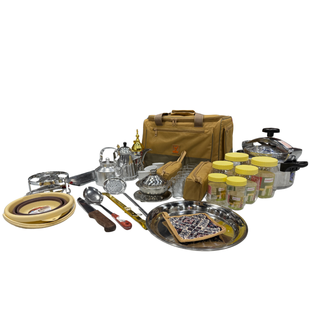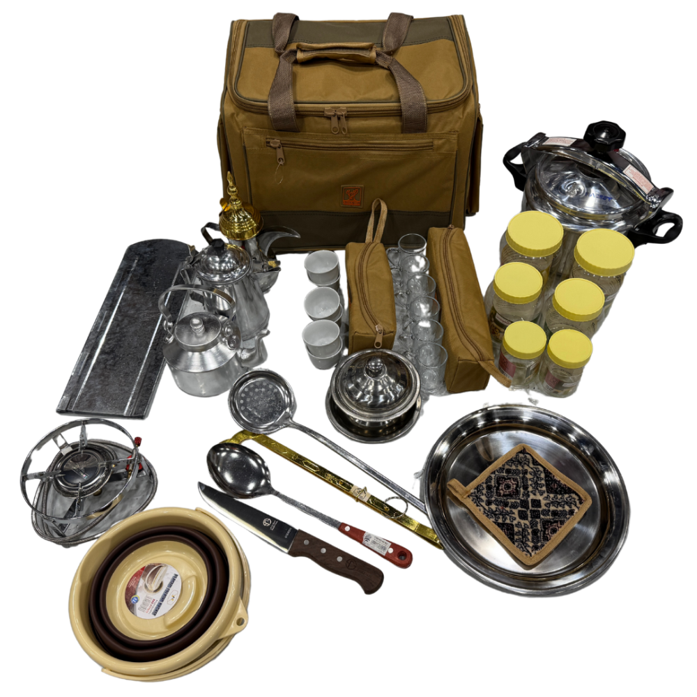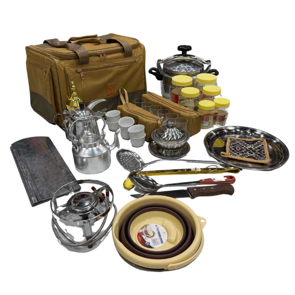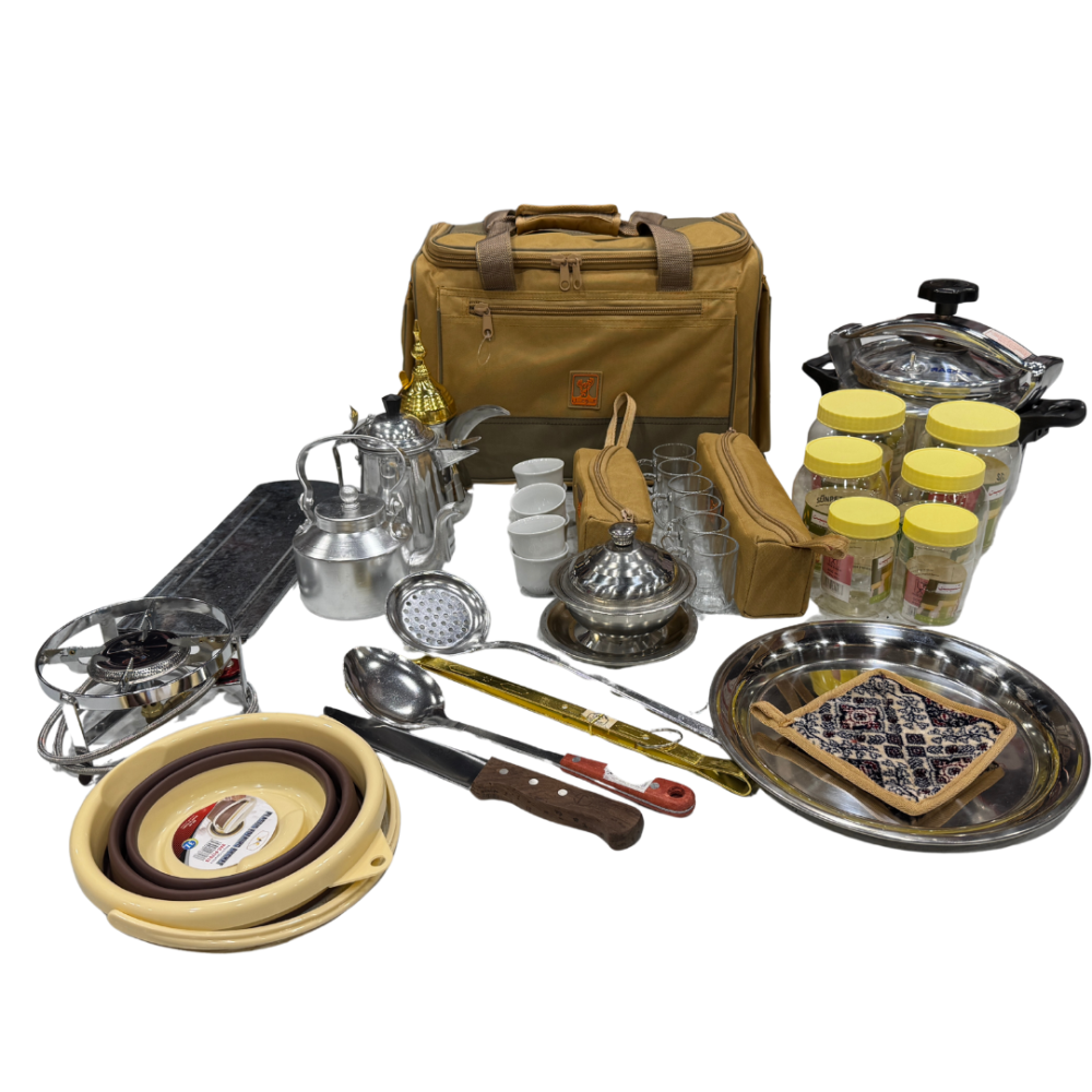 عزبة شاهي وقهوة وطبخ عالية الجودة. مختصرة لغرض الرحلات، وهي ذات مواصفات مثالية كاملة كل ما يلزم من أدوات الشاهي والقهوة وطبخ وجرابات لحفظ أدوات رحلتك والتنقل بها بكل سهولة.