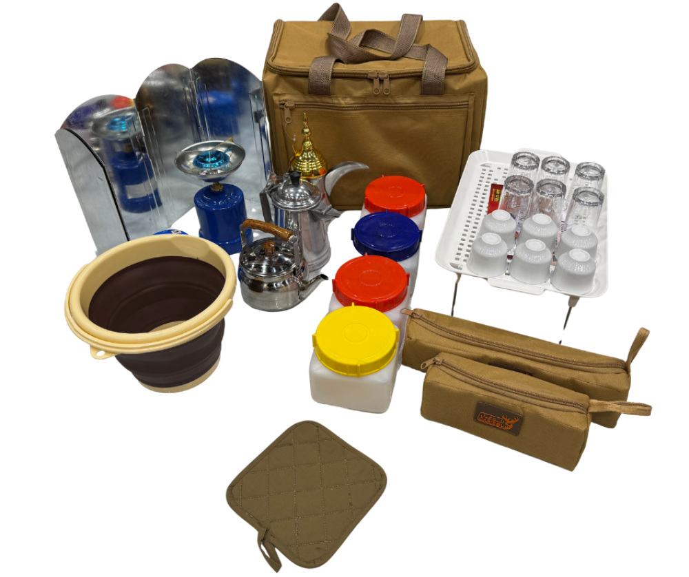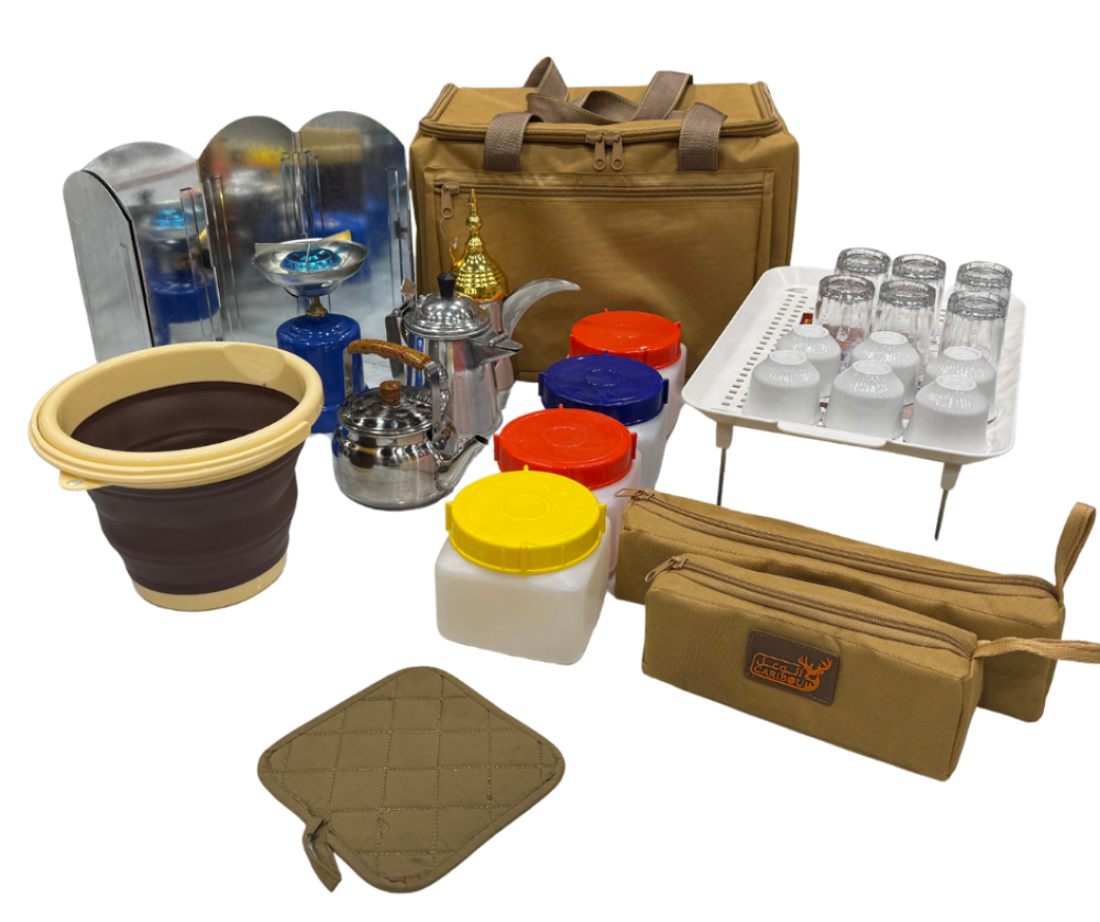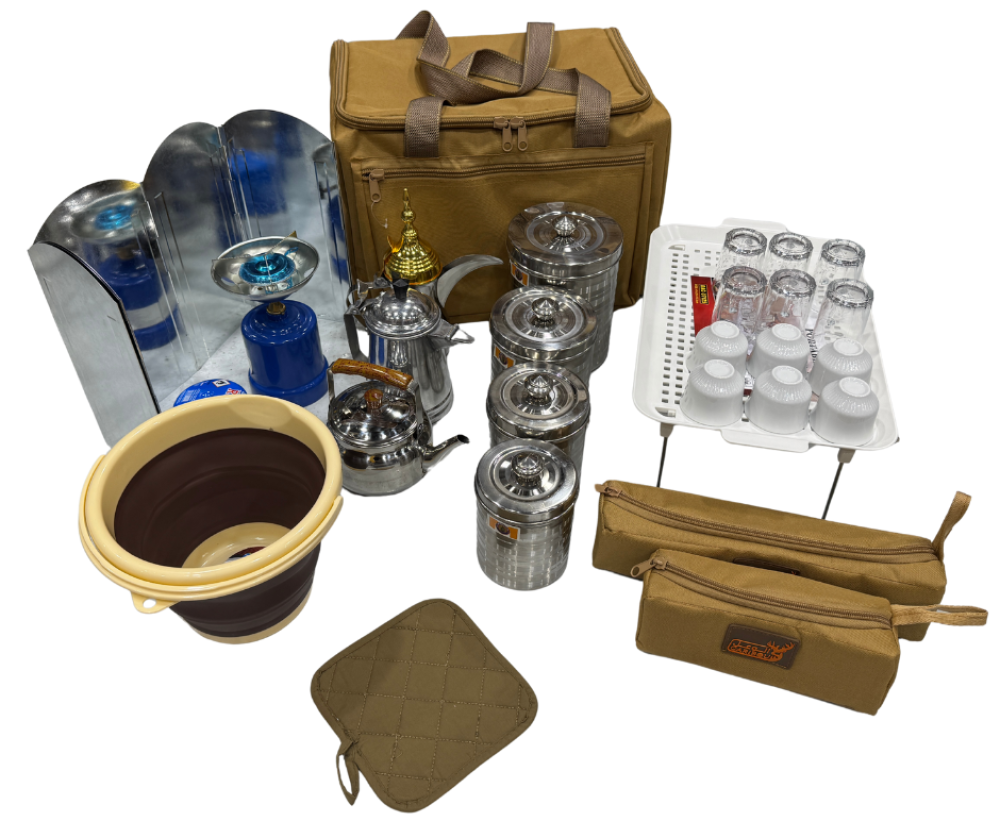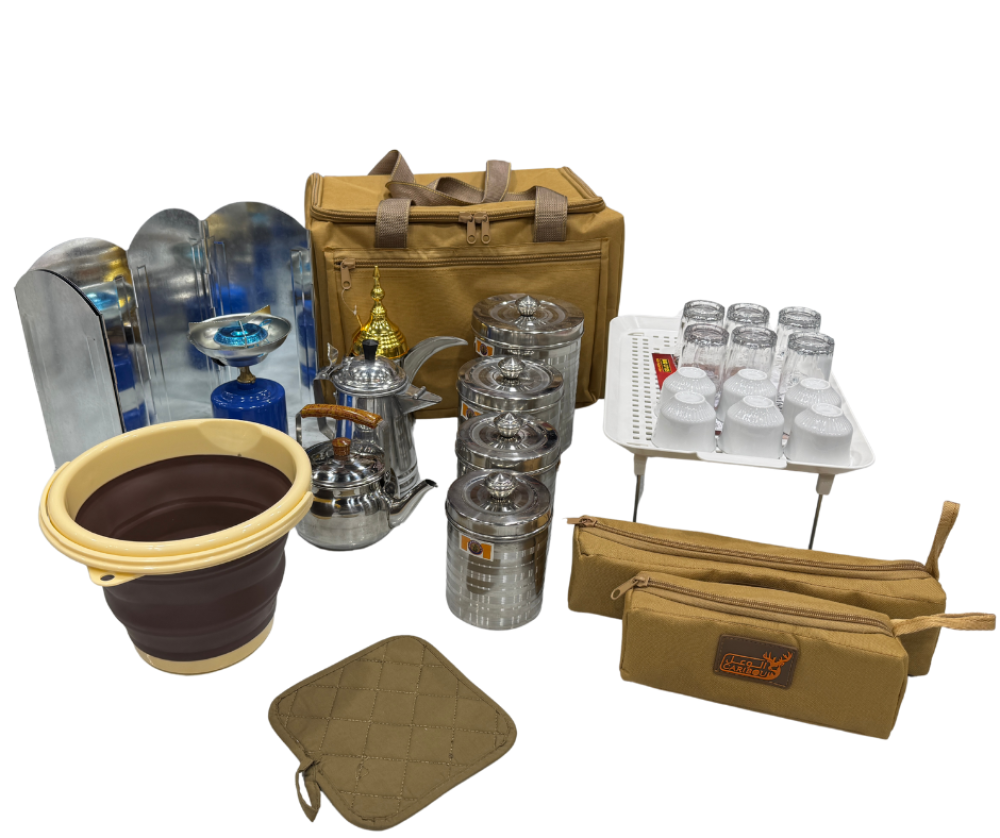 عزبة شاهي وقهوة كاملة . مختصرة لغرض الرحلات، وهي ذات مواصفات مثالية كاملة كل ما يلزم من أدوات الشاهي والقهوة وجرابات لحفظ أدوات رحلتك والتنقل بها بكل سهولة.